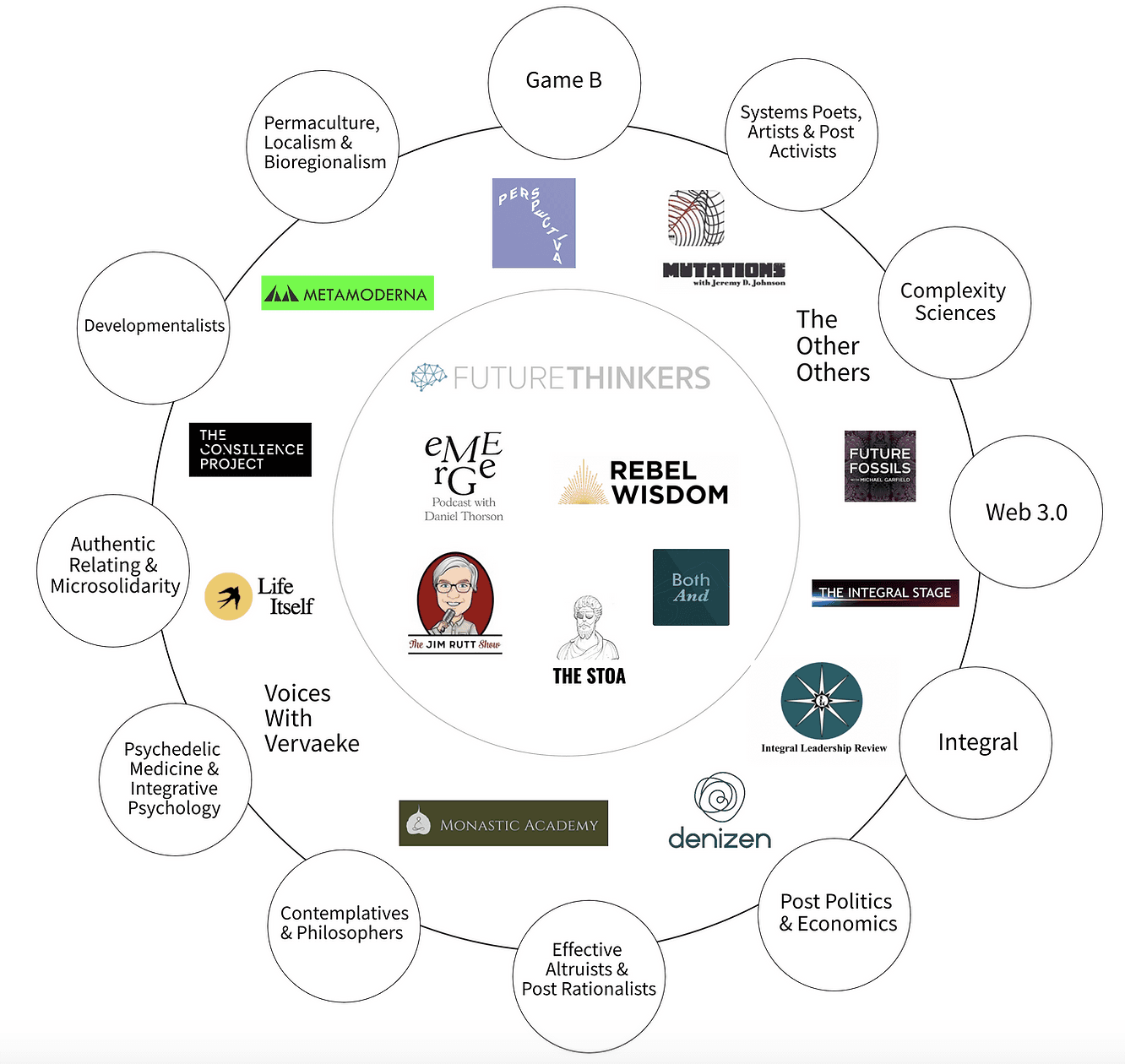 The ecosystem is currently vague, complex, and sprawling. Some of the many names and terms associated with it are: Integral, Metamodern, Regenerative, Metacrisis-aware, Liminal Web, Game B, and more.